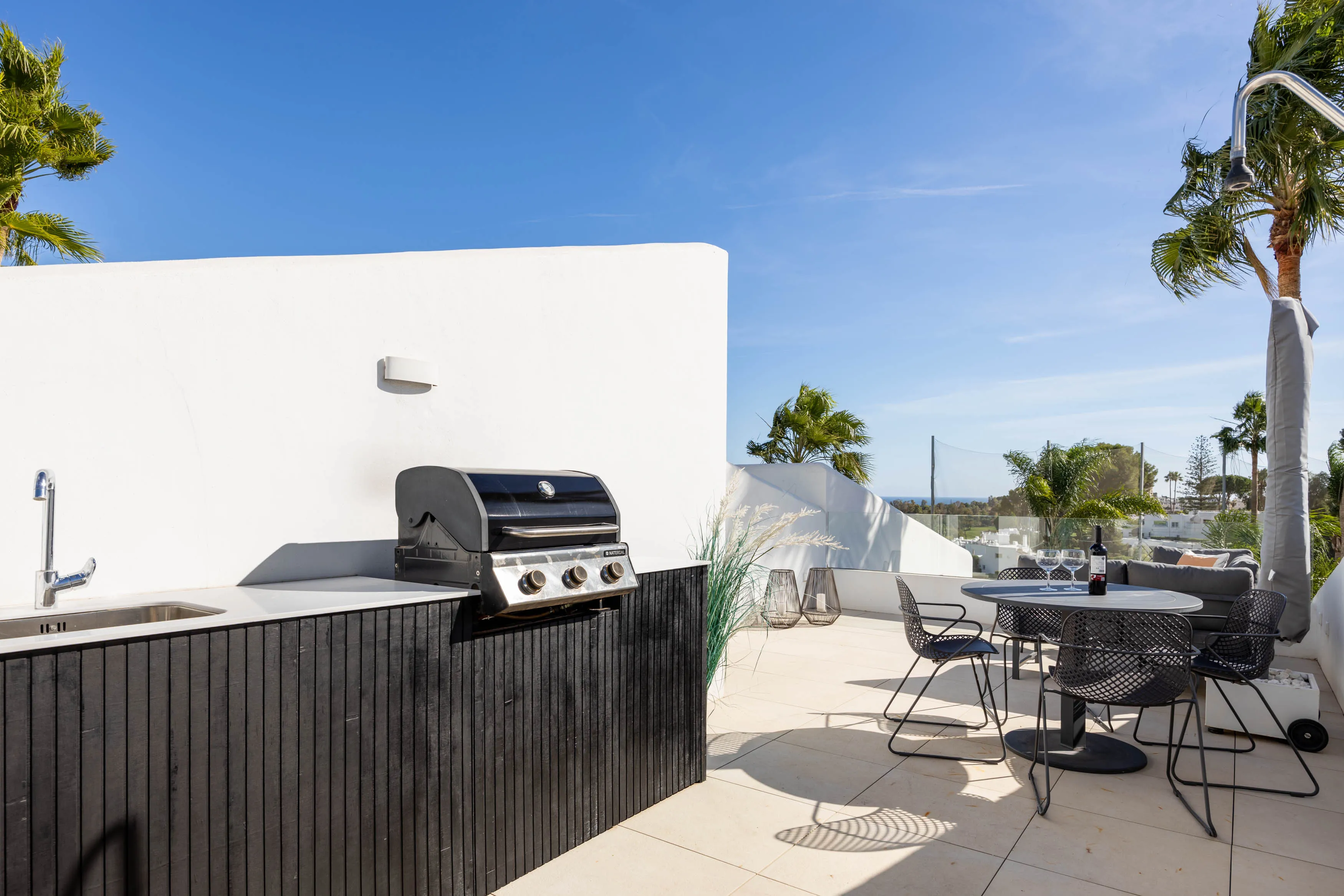 The fully equipped, kitchen flows seamlessly into a bright open-plan living and dining area, filled with natural light. Upstairs, you’ll find a spacious private terrace, perfect for sunbathing, alfresco dining, or simply relaxing while surrounded by greenery and panoramic vistas.
